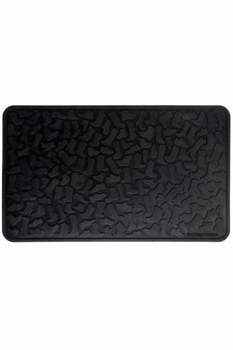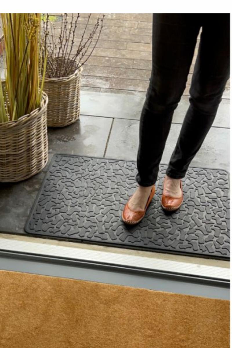 Dørmatten er støpt i 60% resirkulert gummi. Gummien gjør at matten veier en del og ligger tungt og stabilt uten å flytte på seg. De er svært robuste og enkle å rengjøre, enten ved å koste, støvsuge eller spyle av.