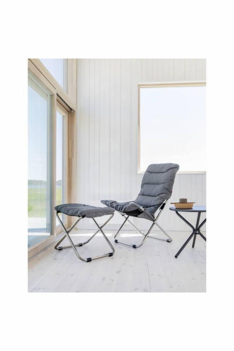 Fiesta Soft er en komfortabel og stilren solstol. Den kan enkelt reguleres i tre posisjoner, den er produsert i aluminium og ruster derfor ikke. Stolen kan fint benyttes ute hele året, fra hagen/terrassen om sommeren, til hytteveggen på vinterfjellet.