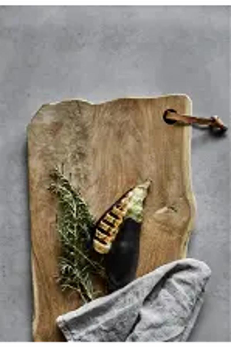 Lyon skjærebrett i naturteak. Det store brettet som kan brukes til både matlaging og servering er et vakkert organisk formet brett, hvor teaketreets form og tekstur definerer skjærebrettet uttrykk. Dette betyr at ueventualiteter, små ubalanser og naturlige hull alle er en del av skjærebrettet unike karakter. Lyon er derfor et helt unikt kjøkkentilbehør som kan variere i både form, nyanse og finish. Lyon skjærebrettet har dessuten en funksjonell lærrem som gjør det enkelt å henge når du ikke bruker det. Skjærebrettet i teak er for deg som ønsker å omgi deg med unike gjenstander definert av naturen med personlighet og unike egenskaper.