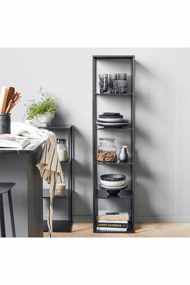 Modell D fra House Doctor er laget av stål og har en glatt finish i en mørk farge. De seks hyllene gir god plass for kjøkkenutstyr, porselen og kokebøker. Hylla passer også fint inn i både stuen og soverommet.