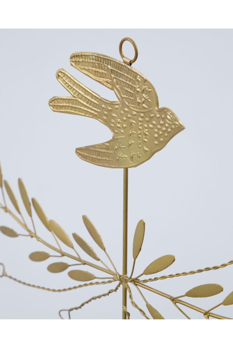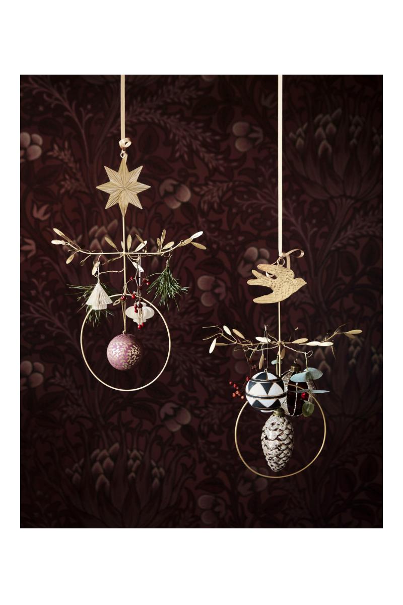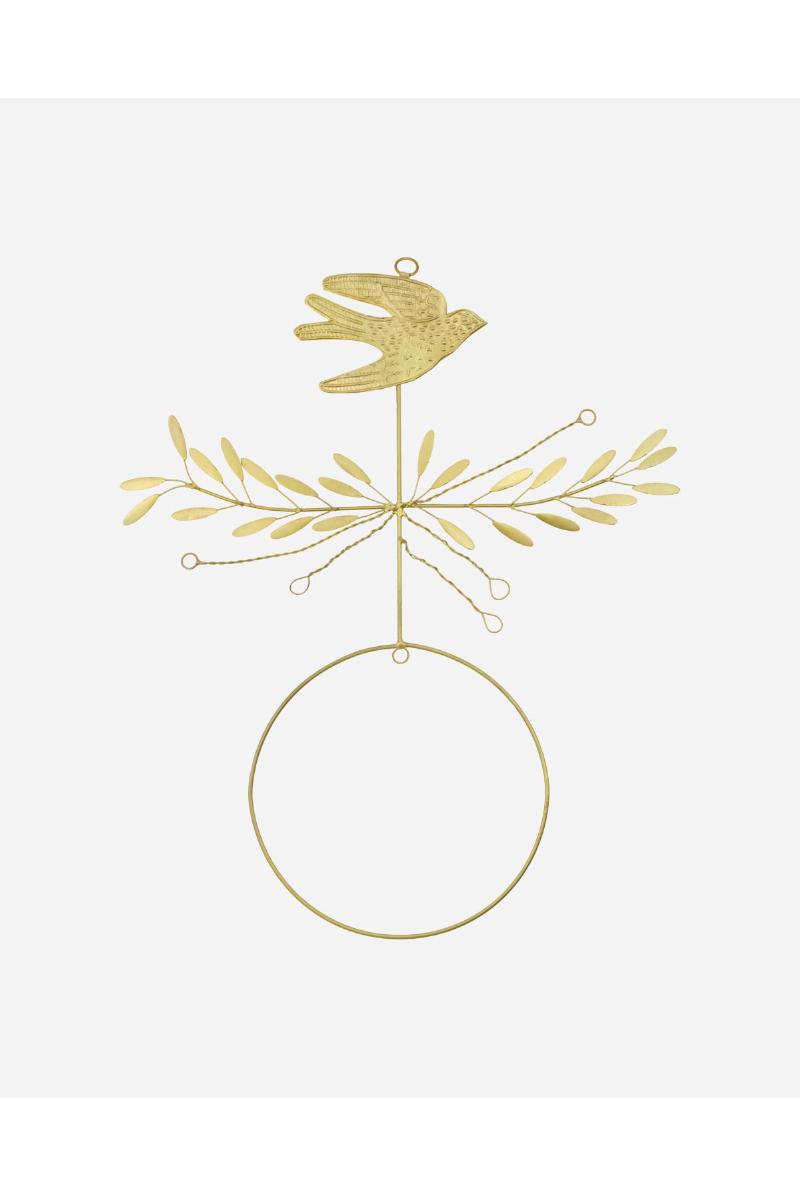 Designet har en gylden messingoverflate, en fugl i toppen, og blader som kan justeres forsiktig etter behov. Dekorer ringen og de små øynene med din yndlingspynt, og avslutt med en flott sløyfe, så du får en personlig og mest av alt unik juledekoration.