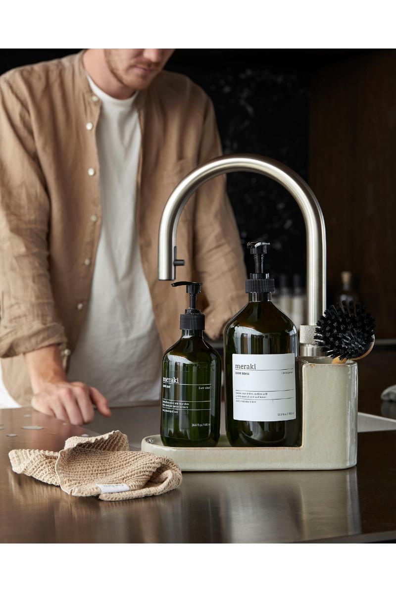 Sett oppvasksåpen, oppvaskbørsten og håndsåpen i dette tidløse og minimalistiske designet fra Meraki. Børste- og såpeholderen er laget av keramikk med en grå glasering for å passe inn i enhver kjøkkeninnredning og bidra til den rolige og naturlige stemningen.