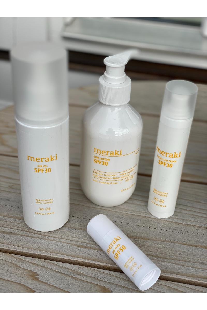 De kjemiske UVA- og UVB-filtrene absorberer skadelige UV-stråler og etterlater ingen hvite rester eller en fettete følelser. Siden den inneholder vitamin E og beroligende aloe vera, blir huden din tilført fuktighet, myk og smidig mens du koser deg i solen. Ansiktssolkremen fra Meraki absorberes raskt og kommer med en lys, blomsterduft med toner av fersk mynte og hvit musk.