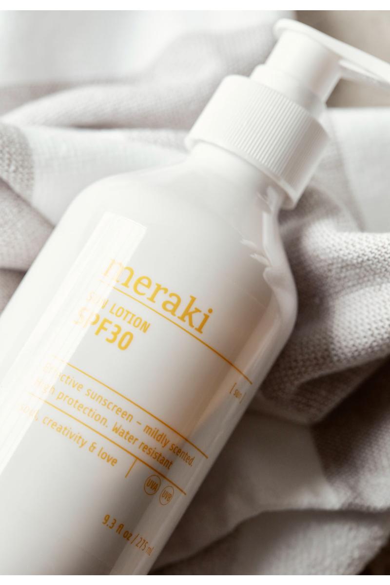 For å holde huden myk og smidig, er vitamin E tilsatt. Solkremen fra Meraki absorberes raskt og har fått en lett blomsterduft med toner av fersk mynte og hvit musk. Innholdet er vegansk. Påfør en sjenerøs mengde og gjenta ofte for optimal beskyttelse. Vent til kremen er absorbert før du kler på deg.