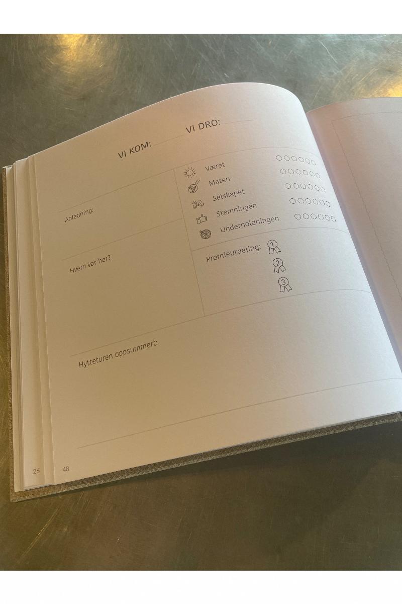 Hytteboken er en innholdsrik og lekker hyttebok som også kan brukes som en “coffee table book”. Den inneholder mange artige sider man kan fylle ut. Bl.a. “om hytta vår”, sjekklister, fjell- og sjøvettregler, spill og vinner oversikt og ikke minst sidene man kan fylle ut etter hvert opphold. Der kan man bl.a. gir karakter på maten, været og underholdningen.