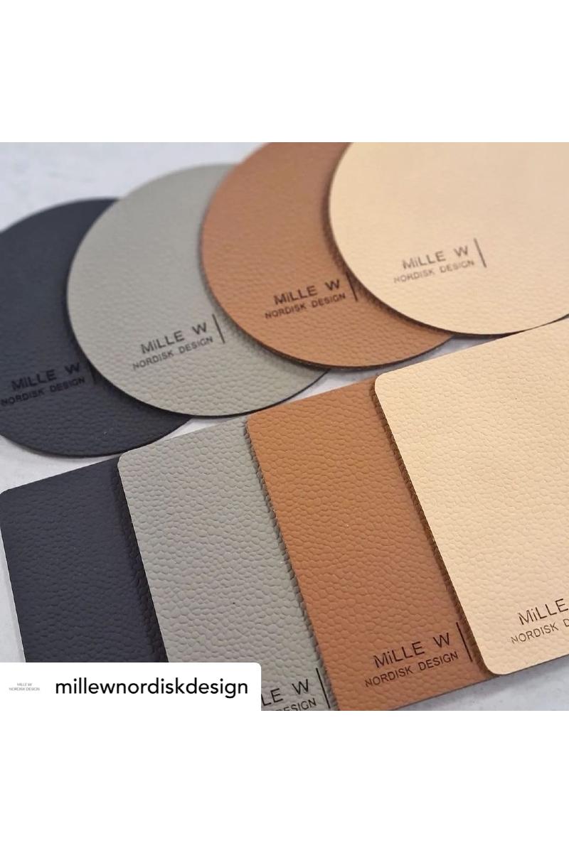 Dekkebrikkene fra Mille W er en bærekraftig innredningsdetalj av resirkulert skinn som er GRS®-sertifisert. Med resirkulert skinn får man følelsen og duften av skinn, og blandet med naturgummi blir de vannavvisende, vametålelige og får høy slitestyrke.