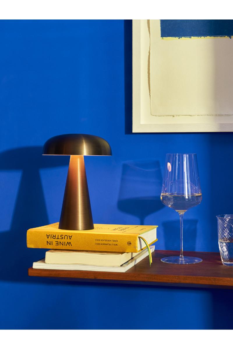 Bordlampen har en robust base som smalner av øverst mot en soppformet lampeskjerm. Lampen har et mykt og behagelig lys som skaper en herlig atmosfære enten du er ute på altanen eller inne i sofaen.