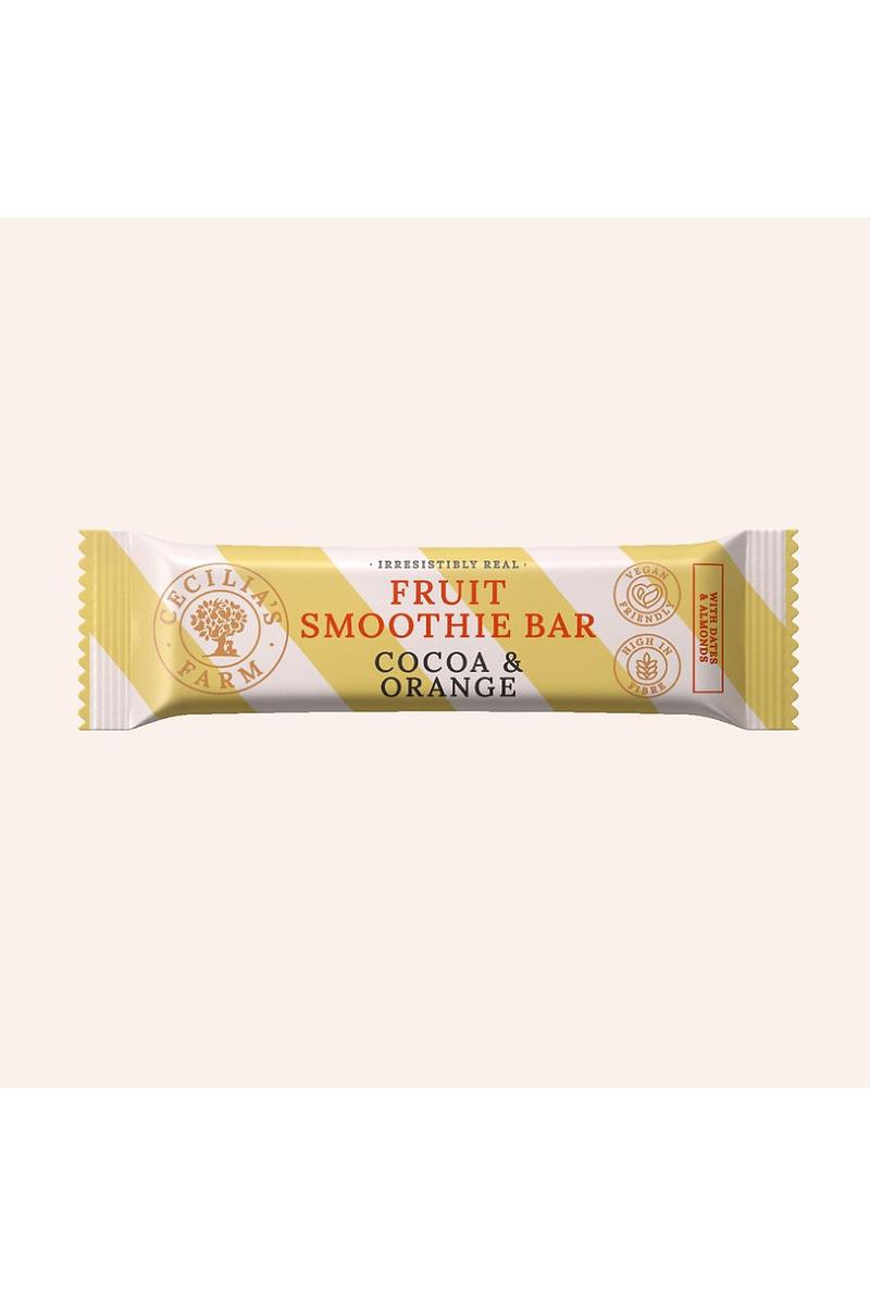 Klassikeren kakao + appelsin – i en myk, fruktig bar uten tilsetningsaromaer. Laget på rene appelsiner, kakao og mandler, med dadler som gir naturlig sødme og den deilige seige «smoothie»-konsistensen. Perfekt «on-the-go».