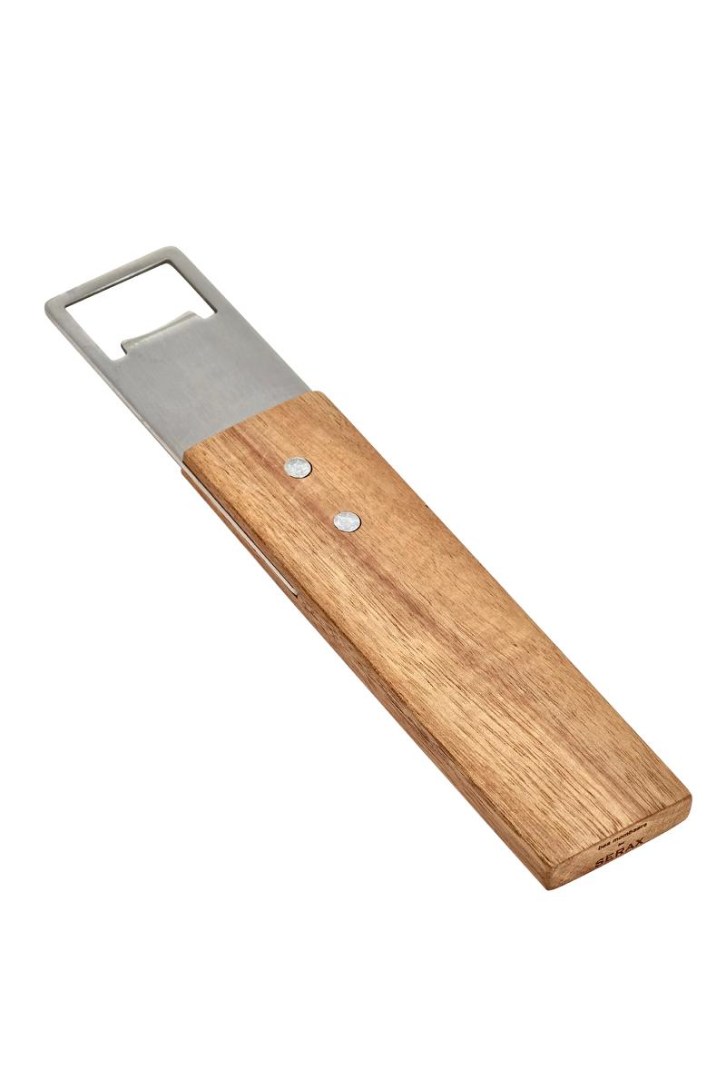 Flaskeåpner fra Serax i acacia tre og matt polert rustfritt stål designet av Bea Mombaer.