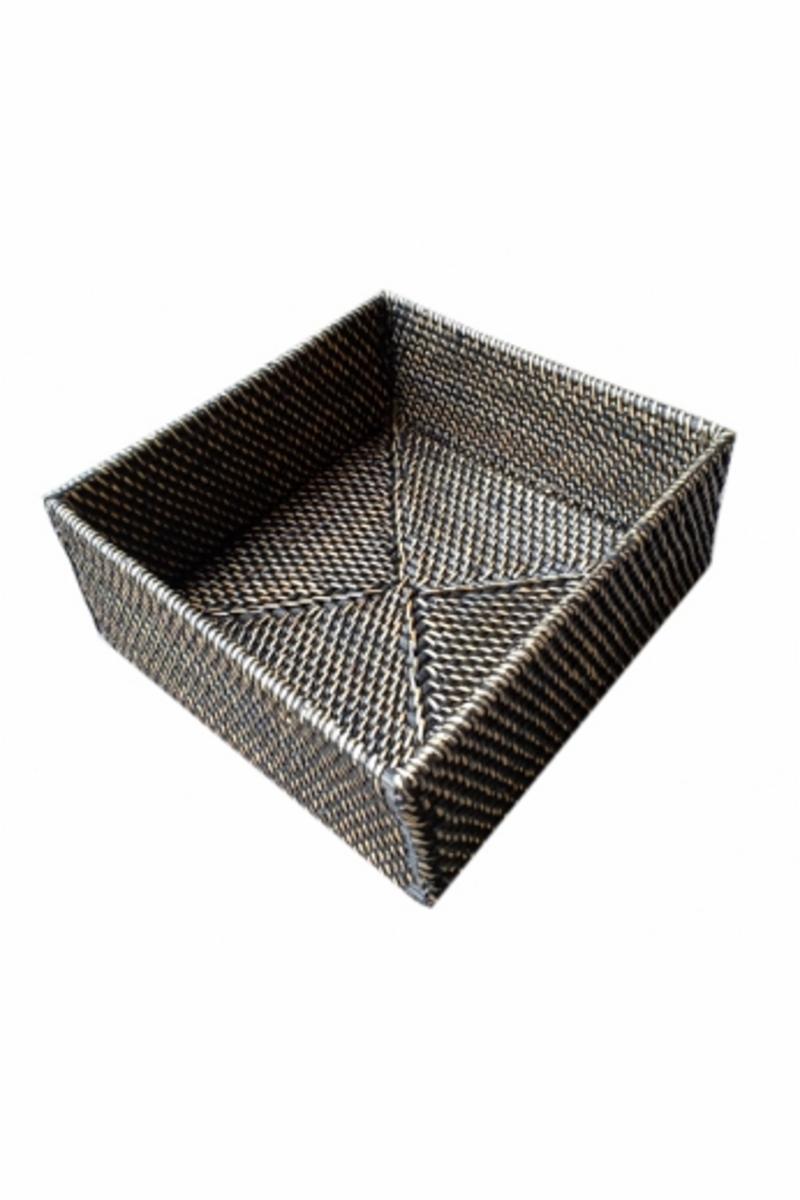Kvadratisk oppbevaringsboks med rette hjørner. Lombok kurv flettet for hånd med ata strå og rattan. Flere lag med svart fargevask og ferniss får stråenes naturlige farge til å skinne gjennom på en vakker måte. Gir gjenstanden varig holdbarhet og et vakkert eksklusivt preg.